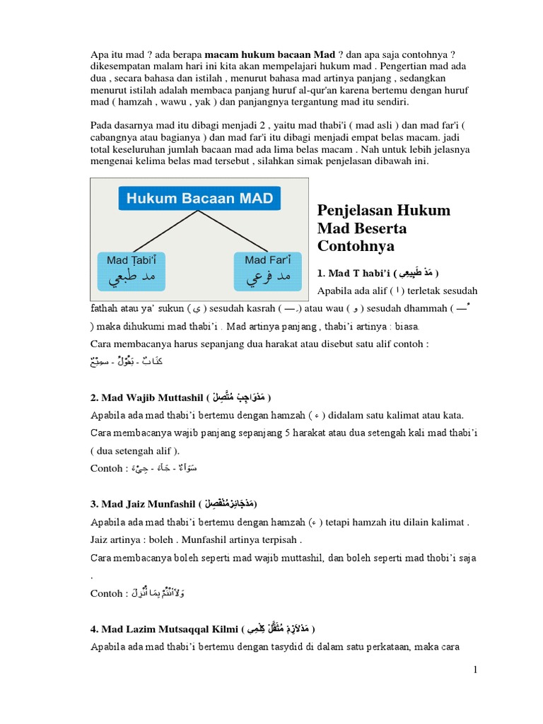 15 Macam Macam Hukum Bacaan Mad Beserta Penjelasannya from duniapondok.com Dalam kondisi demikian, mad asli disebut juga mad thabi'i ( ُّاَلْمَدُّ الطَّبِيْعِي) yaitu mad yang sesuai dengan watak aslinya yang selamat dari tambahan hamzah dan sukun, sehingga tidak menambah panjang bacaaan semula. Jadi mad wajib muttashil ialah wajib dibaca panjang. Mad wajib memiliki arti wajib dibaca panjang, sedangkan muttashil artinya bersambung. المَدُّ الطَّبِيْعِي اَّلذِي لَاتَقُوْمُ ذَاتُ حَرْفِ اْلمَدِّ اِلَّا بِهِ maksud dari pengertian ini yaitu bahwa panjang bacaan mad tak melebihi panjang semula, yakni satu alif karena tak dimasuki hamzah ataupun sukun. See full list on suhupendidikan.com Aug 29, 2020 · pengertian mad badal. Panjang pendek ketukan tersebut disesuaikan dengan irama. Mad asli zhahiry (مَدْ أَصْلِى ظَاهِرِى)yaitu mad asli yang huruf madnya jelas berikut bacaaanya.